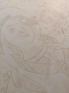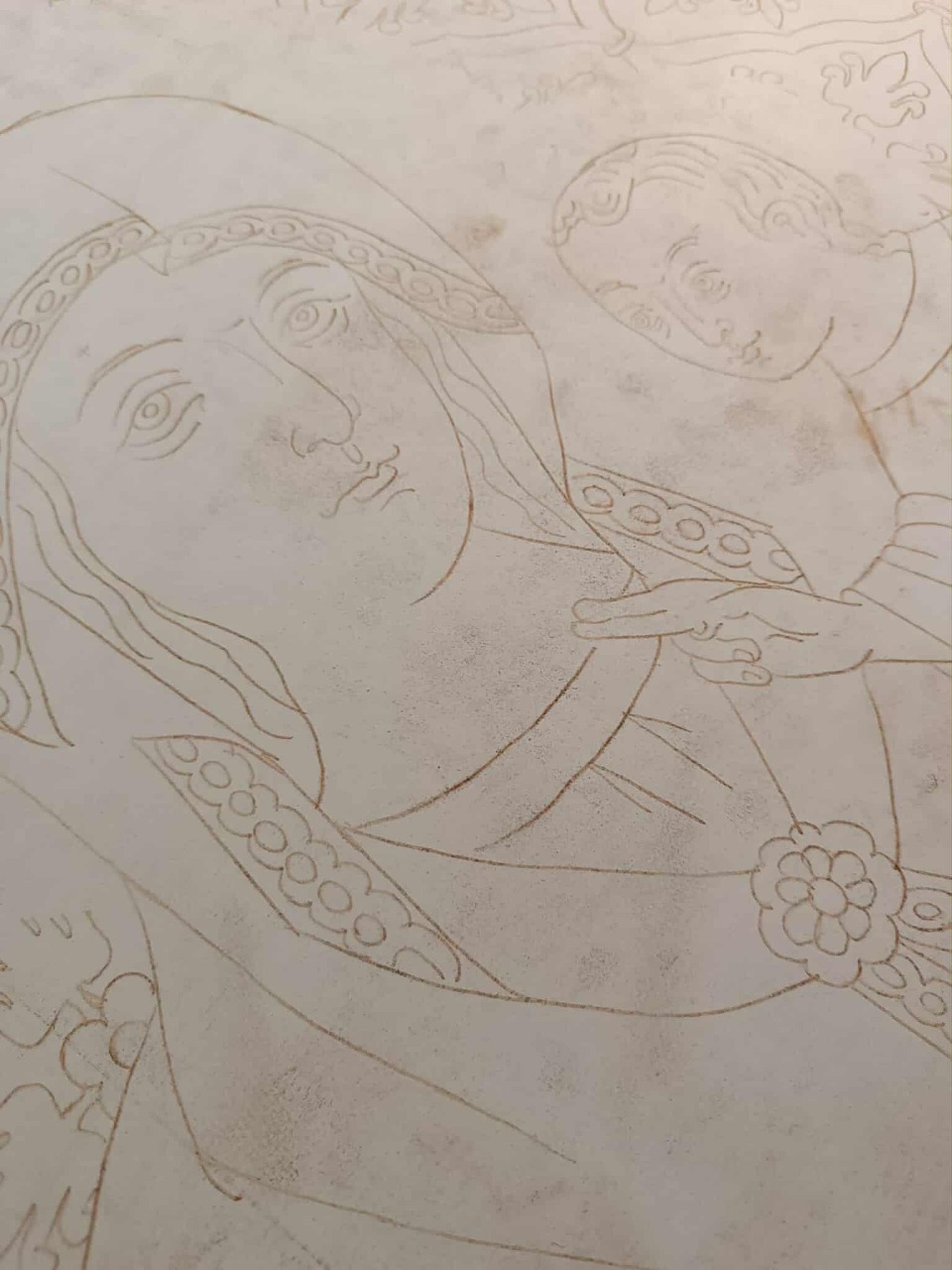 Po Eucharystii dziewczyny przystąpiły do pracy. Najpierw na papier naniesiono pigment. Potem odbito go na desce, żeby przenieść kontur wizerunku. Kasia obrysowała postać Matki Bożej ołówkiem. Dziewczyny zaczęły wycinać tło rylcem. Tło będzie złote. Te małe żłobienia sprawią, że światło będzie inaczej pracować.